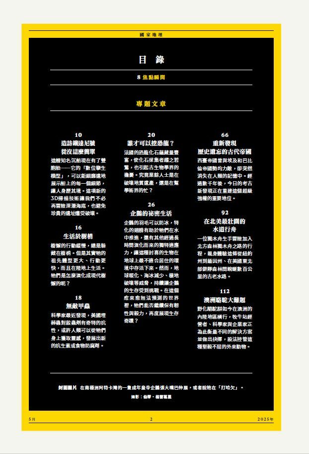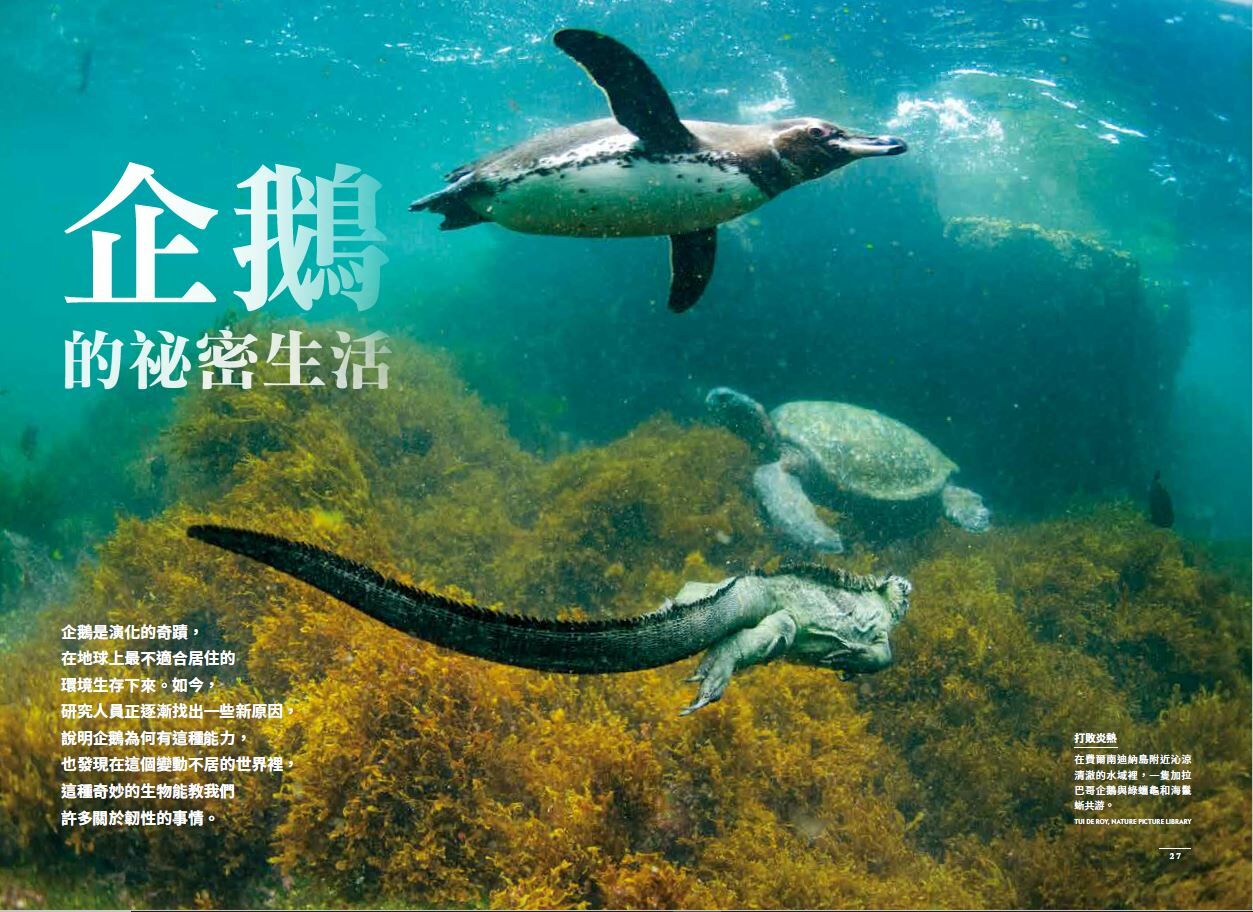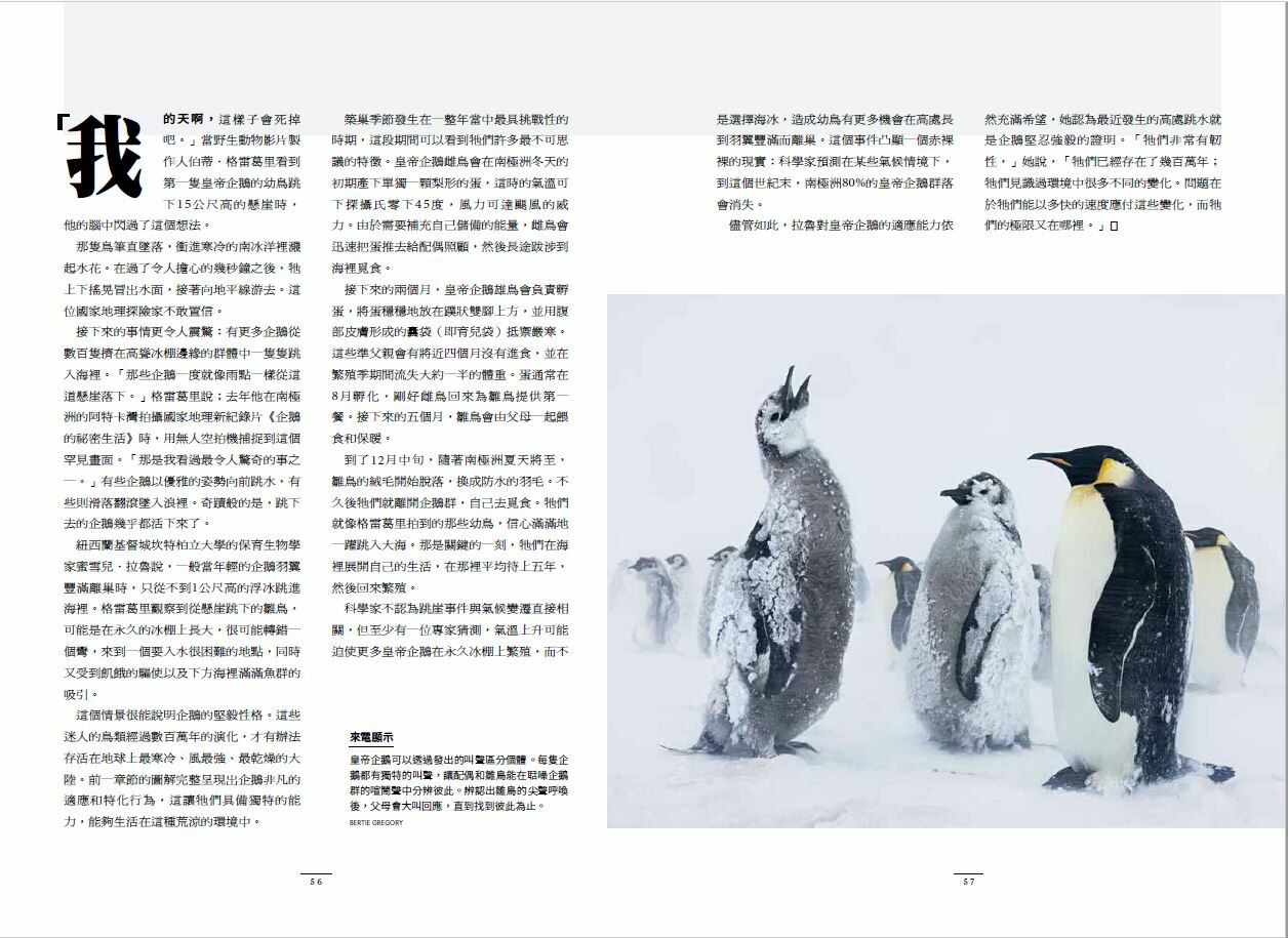 適應能力。牠們正在做出聰明的選擇,調整牠們的棲地、覓食地與築巢地點。本期的雜誌中深入報導了企鵝這種生物的故事,也刊登了歷年來國家地理攝影師在南極拍攝的精采企鵝影像。如果您也喜愛這種神奇的鳥類,也請記得我們的一舉一動其實都與牠們的生存有千絲萬縷的聯繫。關注牠們的生存狀態,其實也是關注我們自己這個物種的未來。