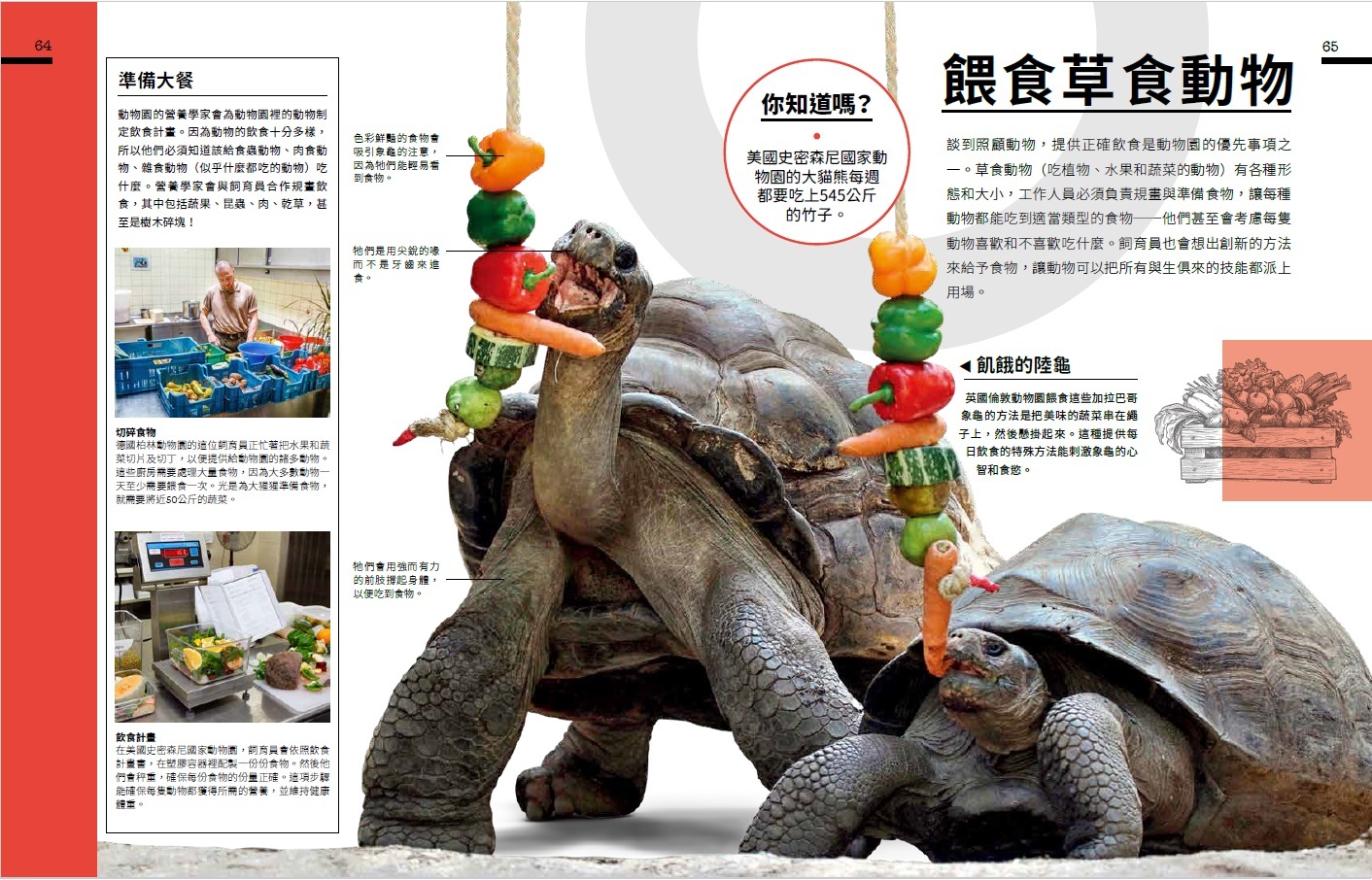 你會發現,測量動物的身高和體重需要特別的工具和技術,很多時候還需要發揮創意與巧思。搬遷動物時,園方會詳細規畫,選擇適當的運輸工具,確保動物在運輸過程中安全又舒適。食物也是一門學問,除了均衡之外,還得設計豐富化活動,讓動物在籠舍中也有機會發揮牠們在野外環境中會用上的本領。