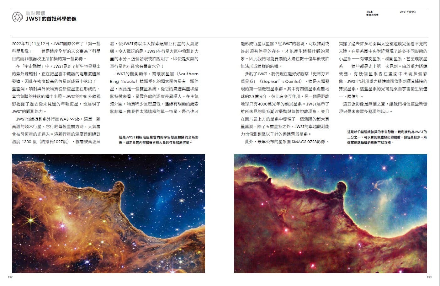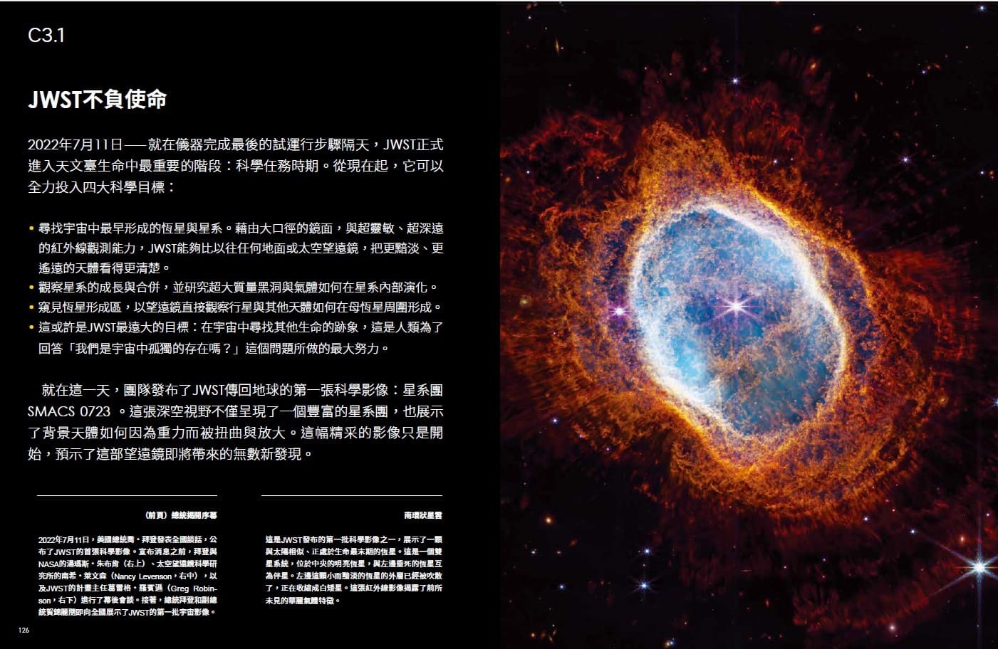 「詹姆斯・韋伯太空望遠鏡自升空至今,已然產出大量的行星、星雲和星系影像,這些影像不但令人目不暇給,且充滿了啟發性。這本書不僅能讓你欣賞到其中最精華的部分,更重要的是,還帶你深入了解這些影像背後的科學內容,進而對我們的宇宙產生更深刻、更透徹的體悟。」——尚・卡羅(Sean Carroll),理論物理學家,《潛藏的宇宙》(Something Deeply Hidden)作者