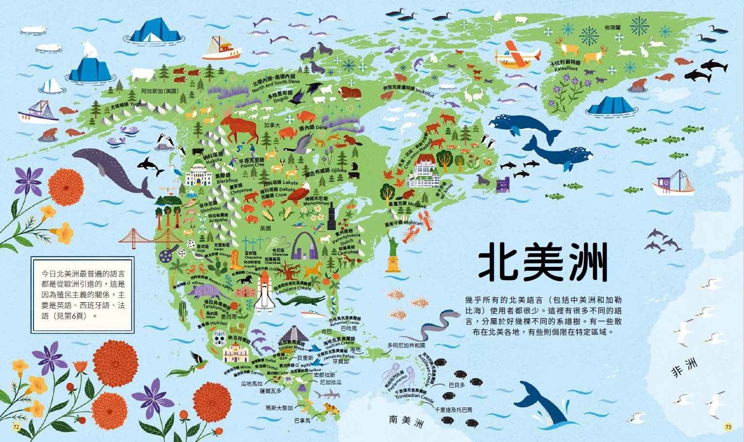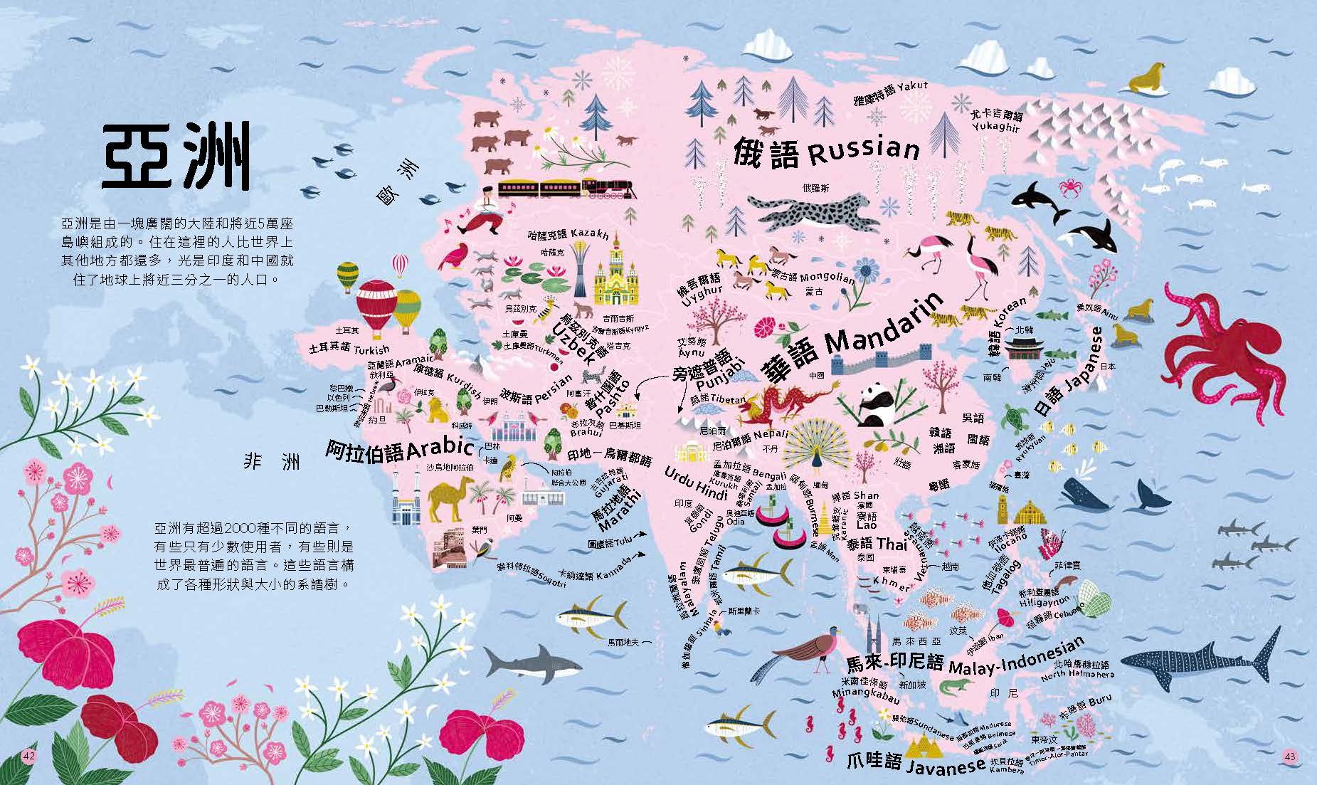 本書劃分為六大洲(因為目前還沒有人永久居住在第七大洲──南極洲)。每一洲的開始都有一張地圖,展示源自那一洲的許多語言在哪裡使用。書中也處處可見語言的系譜樹……