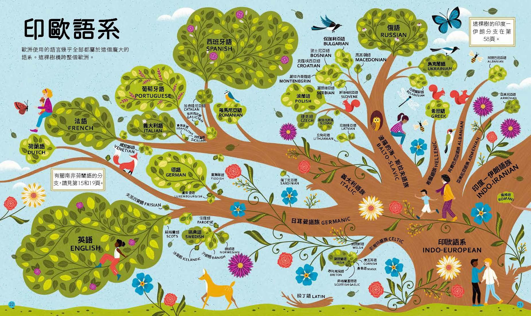 由於篇幅有限,本書只介紹世界上眾多語言中的一部分。書中沒有特別介紹的語言都以語言系譜樹上的樹葉和樹枝表示。