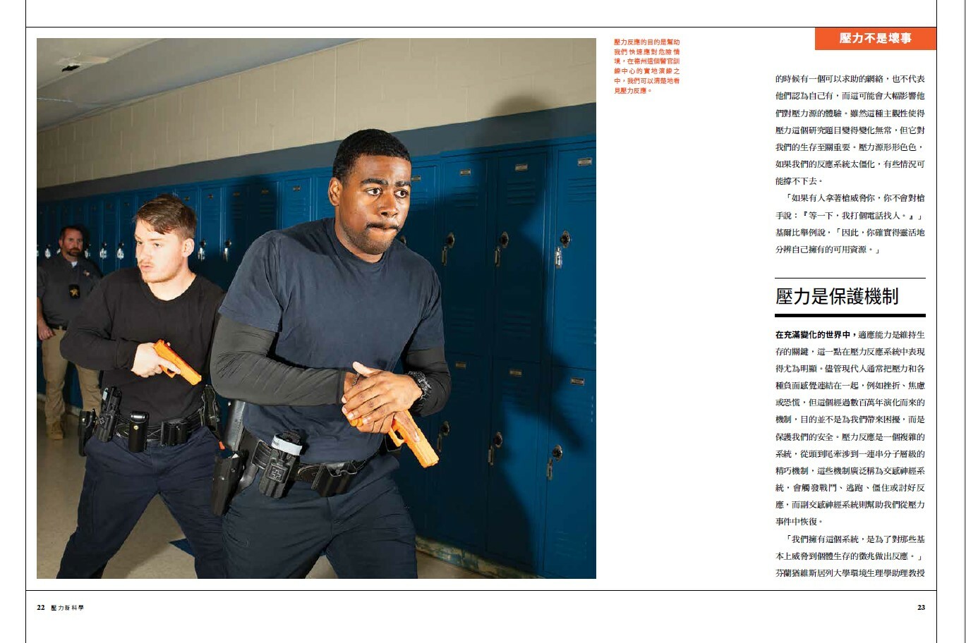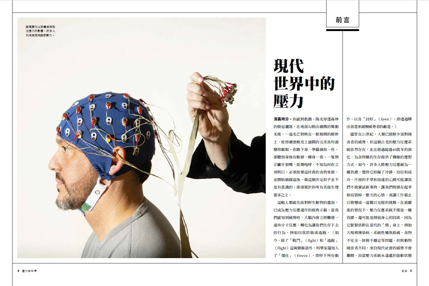 這幅野生動物面對人類祖先的畫面,已成為壓力反應運作的經典示範:當我們感知到威脅時,大腦內便會立即觸發一連串分子反應,轉化為保護我們生存的行為,例如自我防衛或逃跑。(如今,除了「戰鬥」(fight)和「逃跑」(flight)這兩個術語外,科學家還加入了「僵住」(freeze),即停下所有動作,以及「討好」(fawn),即透過表現友好來緩解威脅者的敵意。)