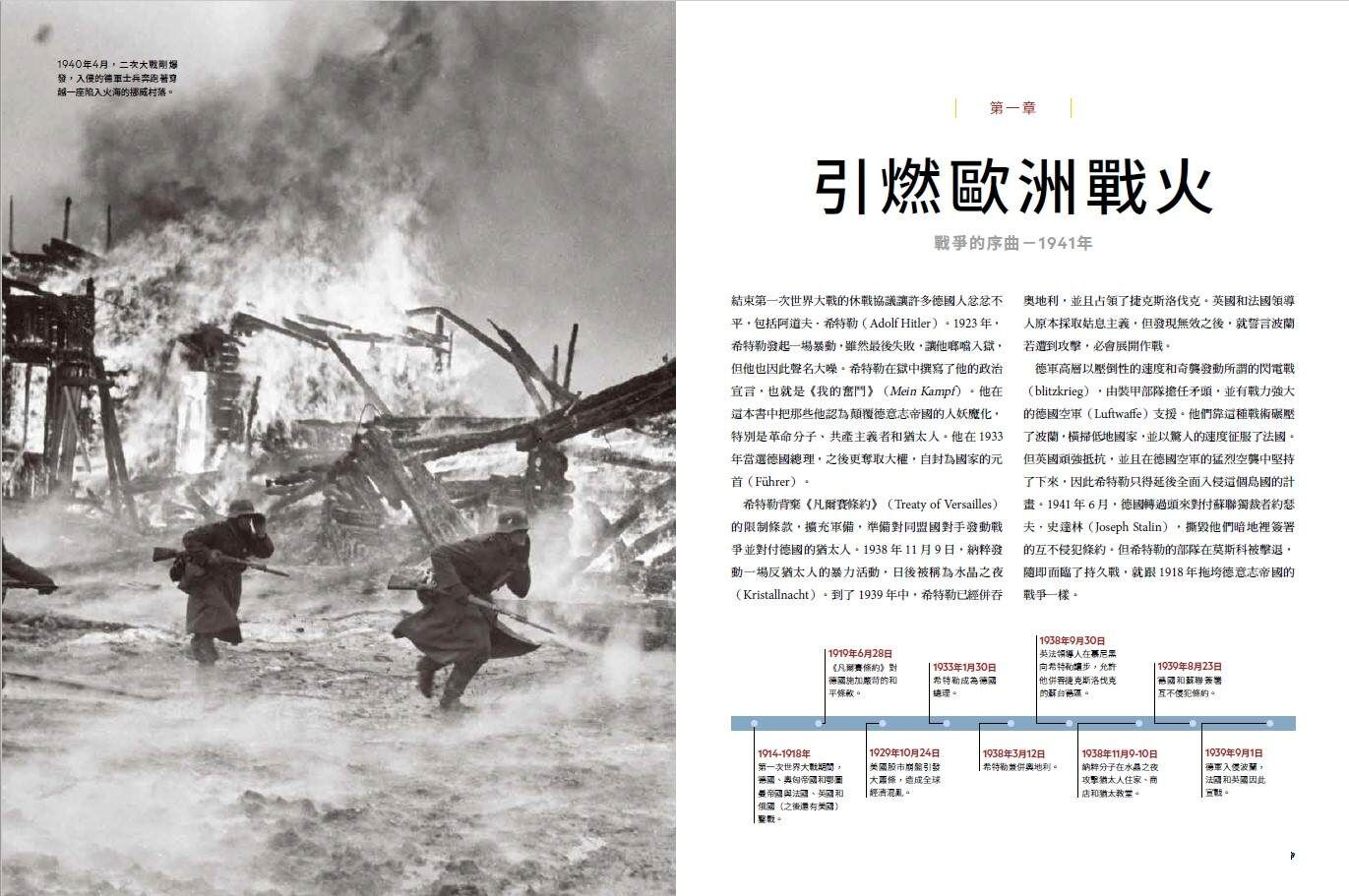 德軍高層發動所謂的閃電戰(blitzkrieg),由裝甲部隊擔任矛頭,並且有戰力強大的德國空軍(Luftwaffe)支援,挾帶壓倒性的速度和奇襲力量,這種戰術粉碎了波蘭,橫掃低地國家,並以驚人的速度征服了法國,然而英國抗拒入侵,並在德國空軍的猛烈空襲中堅持下來,因此希特勒只得延後全面入侵這個島國的計畫。1941年6月,德國轉過頭來對付蘇聯獨裁者約瑟夫.史達林(Joseph Stalin),撕毀他們暗地裡簽署的互不侵犯協定,但是希特勒的部隊在莫斯科被擊退,隨即面臨了持久戰,就跟1918年拖垮德意志帝國的戰爭一樣。