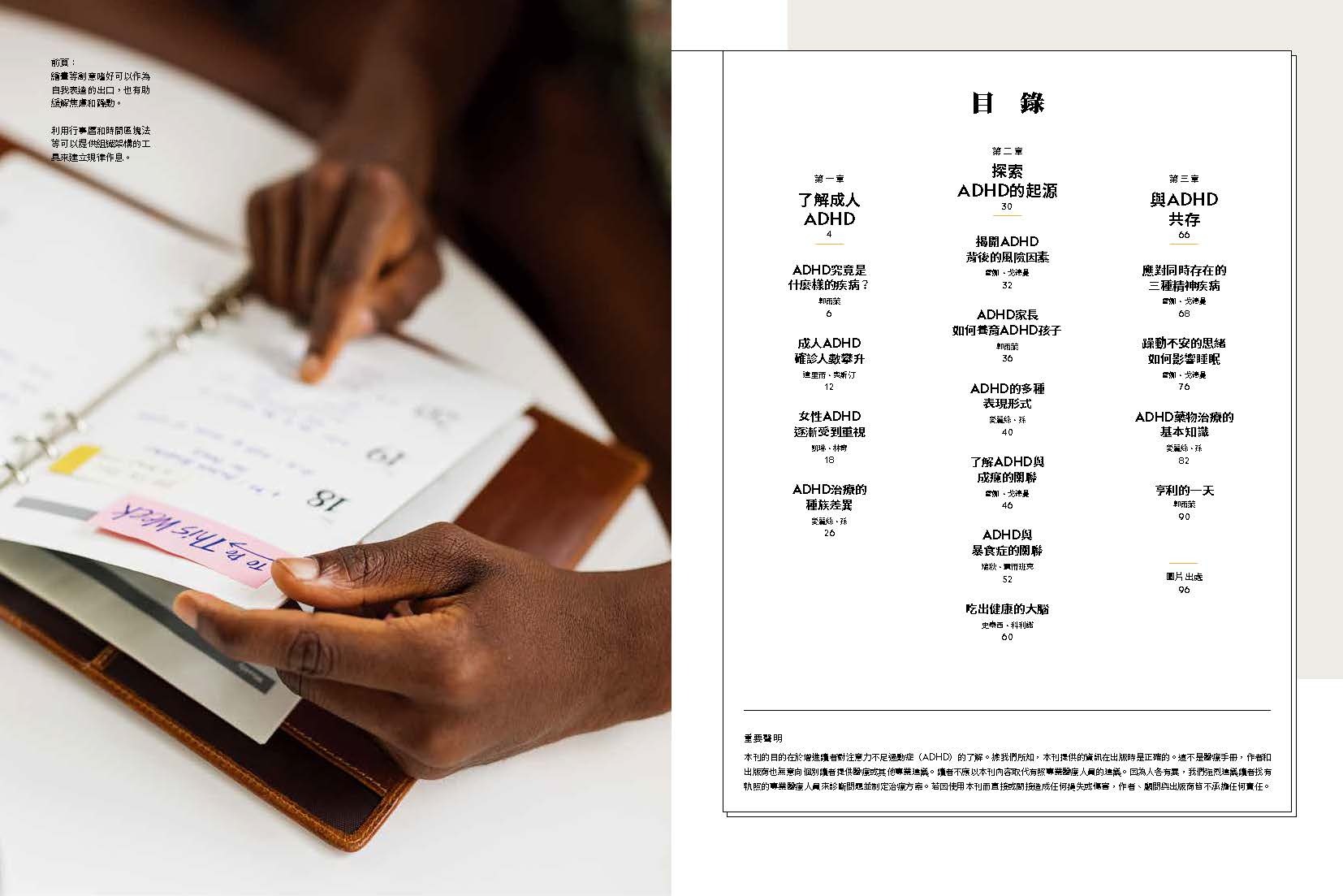 這本特刊的目的在增進讀者對注意力不足過動症(ADHD)的了解。據我們所知,本刊提供的資訊在出版時是正確的。這不是醫療手冊,作者和出版商也無意向個別讀者提供醫療或其他專業建議。讀者不應以本刊內容取代有執照的專業醫療人員的建議。因為人各有異,我們強烈建議讀者找有執照的專業醫療人員來診斷問題並制定治療方案。若因使用本刊而直接或間接造成的任何損失、傷害或損害,作者、顧問和出版商不承擔任何責任。