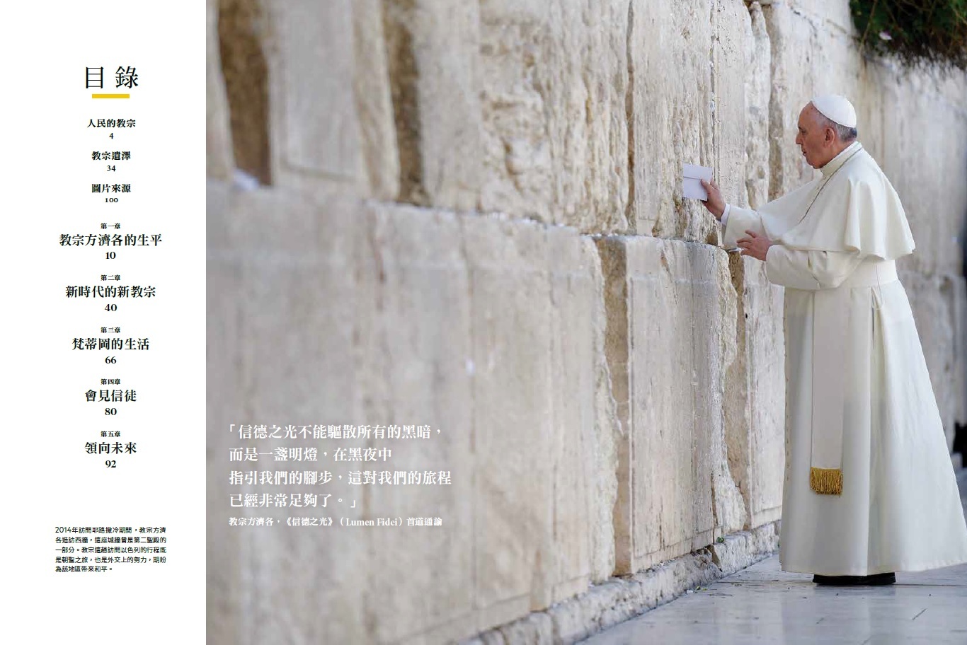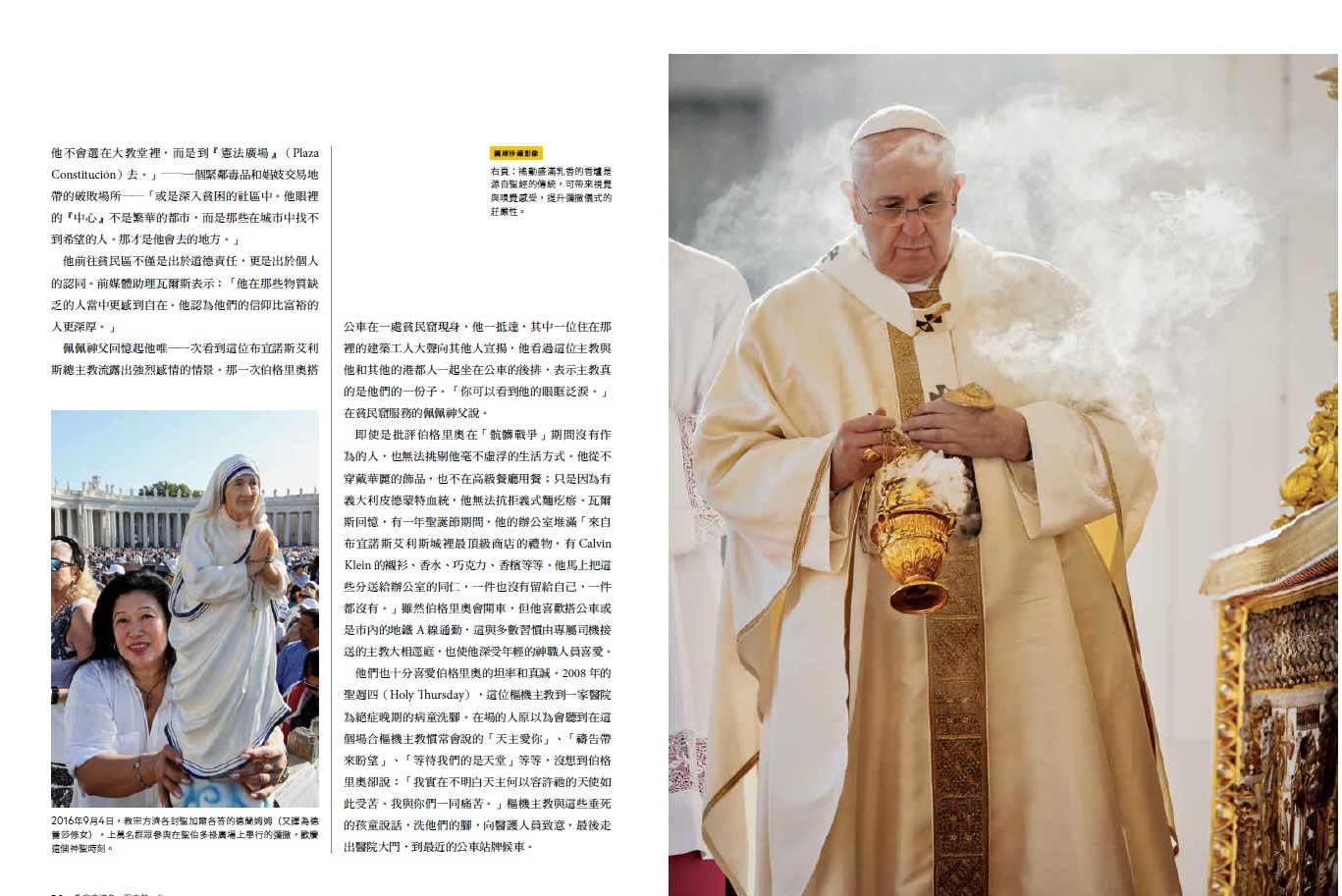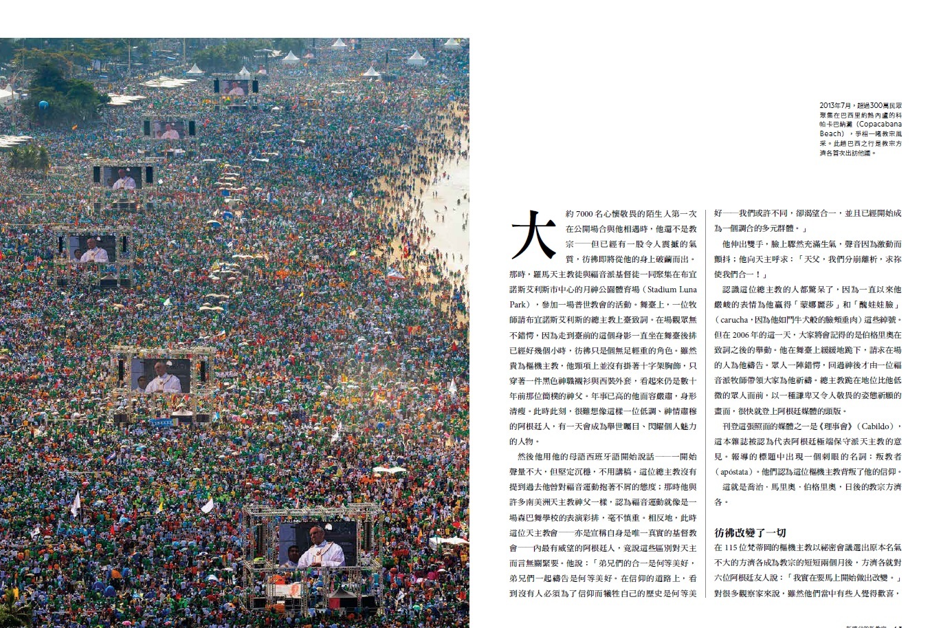 大約7000名心存敬畏的陌生人第一次在公開場合上看見他時,他還不是教宗——但是他裡頭有一股令人震撼的氣質正在湧動。那時,羅馬天主教徒與福音派基督徒一同聚集在布宜諾斯艾利斯市中心的月神公園體育場,參與一場普世教會的活動。舞台上,一位牧師請布城的總主教上台致詞。在場觀眾無不錯愕,因為走上前來的這個身影,已經坐在舞台後排數個小時,觀眾根本看不出他是顯赫人物。雖然貴為樞機主教,他頸項上並沒有掛著十字架胸飾,只穿著一件黑色神職襯衫與西裝外套,看起來仍是數十年前那位簡樸的神父。年事已高的他面容嚴肅,身形清瘦。此時此刻,很難想像如此低調、神情憂悒的阿根廷人有一天會成為舉世矚目、閃耀個人魅力的人物。
