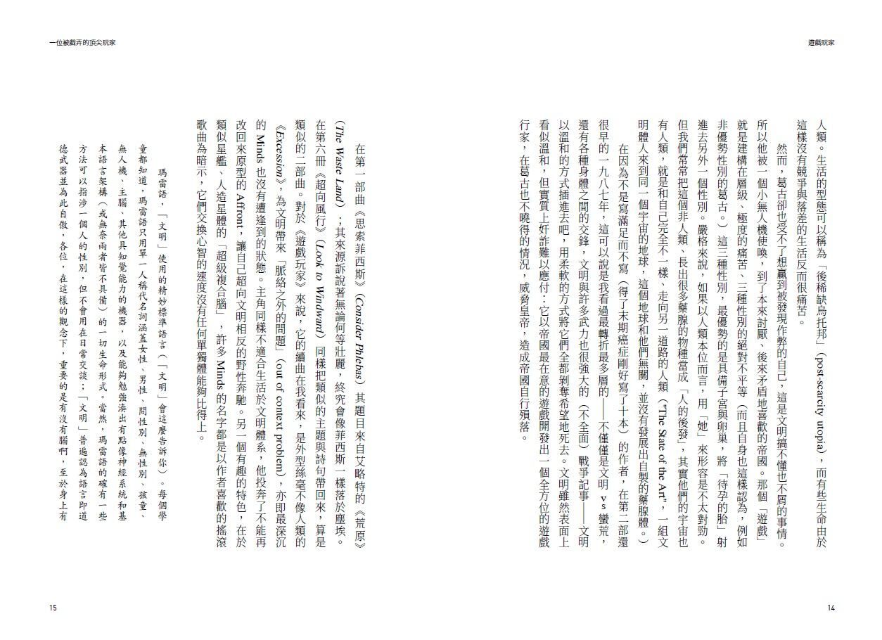 在第一部曲《思索菲西斯》(Consider Phlebas)其題目來自艾略特的《荒原》(The Waste Land);其來源訴說著無論何等壯麗,終究會像菲西斯一樣落於塵埃。在第六冊《超向風行》(Look to Windward)同樣把類似的主題與詩句帶回來,算是類似的二部曲。對於《遊戲玩家》來說,它的續曲在我看來,是外型絲毫不像人類的《Excession》,為文明帶來「脈絡之外的問題」(out of context problem),亦即最深沉的Minds也沒有遭逢到的狀態。主角同樣不適合生活於文明體系,他投奔了不能再改回來原型的Affront,讓自己超向文明相反的野性奔馳。另一個有趣的特色,在於類似星艦、人造星體的「超級複合腦」,許多Minds的名字都是以作者喜歡的搖滾歌曲為暗示,它們交換心智的速度沒有任何單獨體能夠比得上。