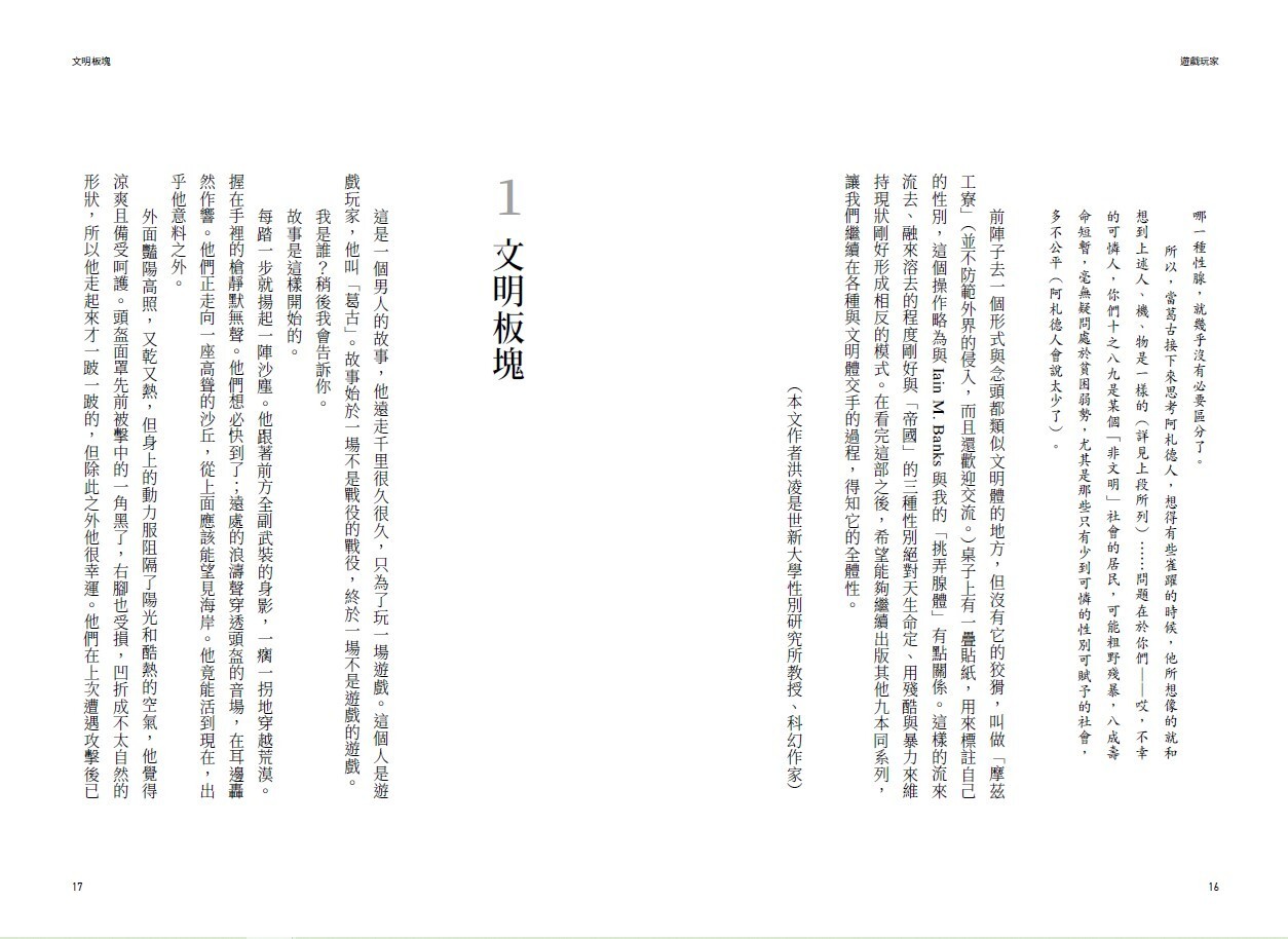 儘管系列的開端是《Consider Phlebas》,但對於初次接觸的讀者而言,第二部《遊戲玩家》無疑更適合做為入門起點。《Consider Phlebas》偏向傳統太空冒險,敘事龐雜而略顯拖沓;再加上主角立場站在「文明」的對立面,讀者往往透過帶有偏見的濾鏡覘看,難以掌握「文明」的完整面貌。《遊戲玩家》則從「文明」內部出發,讀者恰恰可以好整以暇地透過主人翁葛古(Jernau Morat Gurgeh)和他周遭人物環境的描寫,將這個龐大烏托邦的特色盡收眼底。