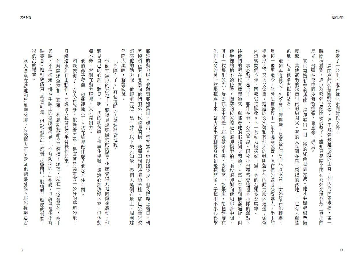 「專心點,葛古!」耶雅在他一旁笑著說。兩枚小飛彈察覺這裡是小隊的弱點,往他們的所在位置猛衝過來,單膝著地的耶雅側身閃過了。葛古有看到機器逼近,但他手裡的槍不聽使喚,瞄準的位置總是比飛彈慢半拍。兩枚飛彈衝向他和耶雅中間,其中一枚爆出閃光,旋即在空中解體,耶雅歡呼出聲,緊接著一記飛腿,想把盤旋在他們之間的另一枚飛彈踢下來。葛古笨手笨腳轉身想朝飛彈開槍,子彈卻不小心誤擊耶雅的動力服。他聽到耶雅驚叫,飆出一聲咒罵。她踉蹌幾步,但及時轉正槍口,朝著掉頭正要再度衝向他們的第二枚飛彈開槍,飛彈四周頓時噴湧沙柱。紅色脈衝光波照亮他的動力服,他眼前忽然一黑,脖子以下失去知覺,整個人癱倒在地上。周圍驟然陷入黑暗,聲響寂滅。